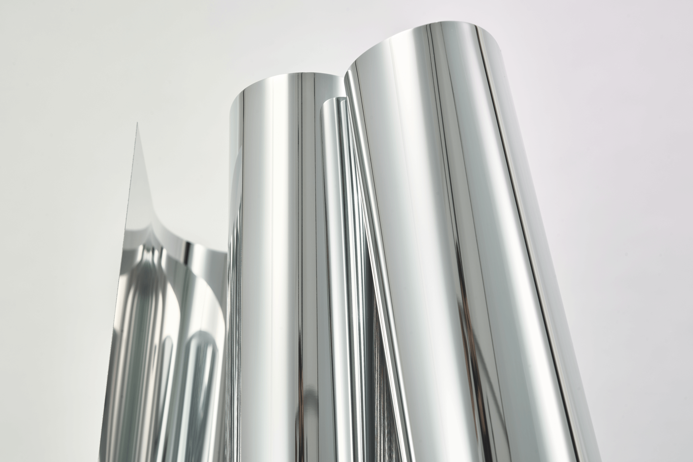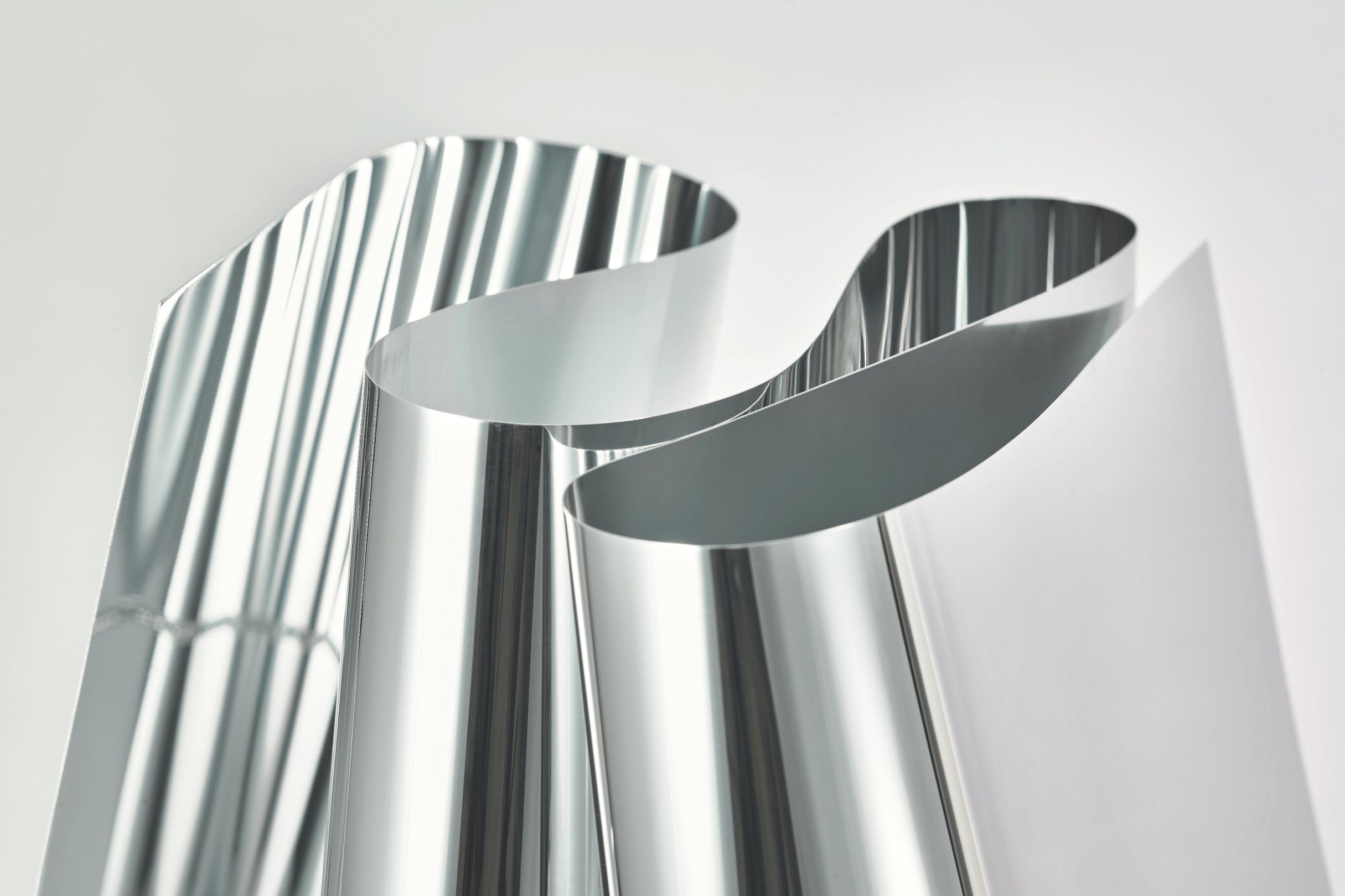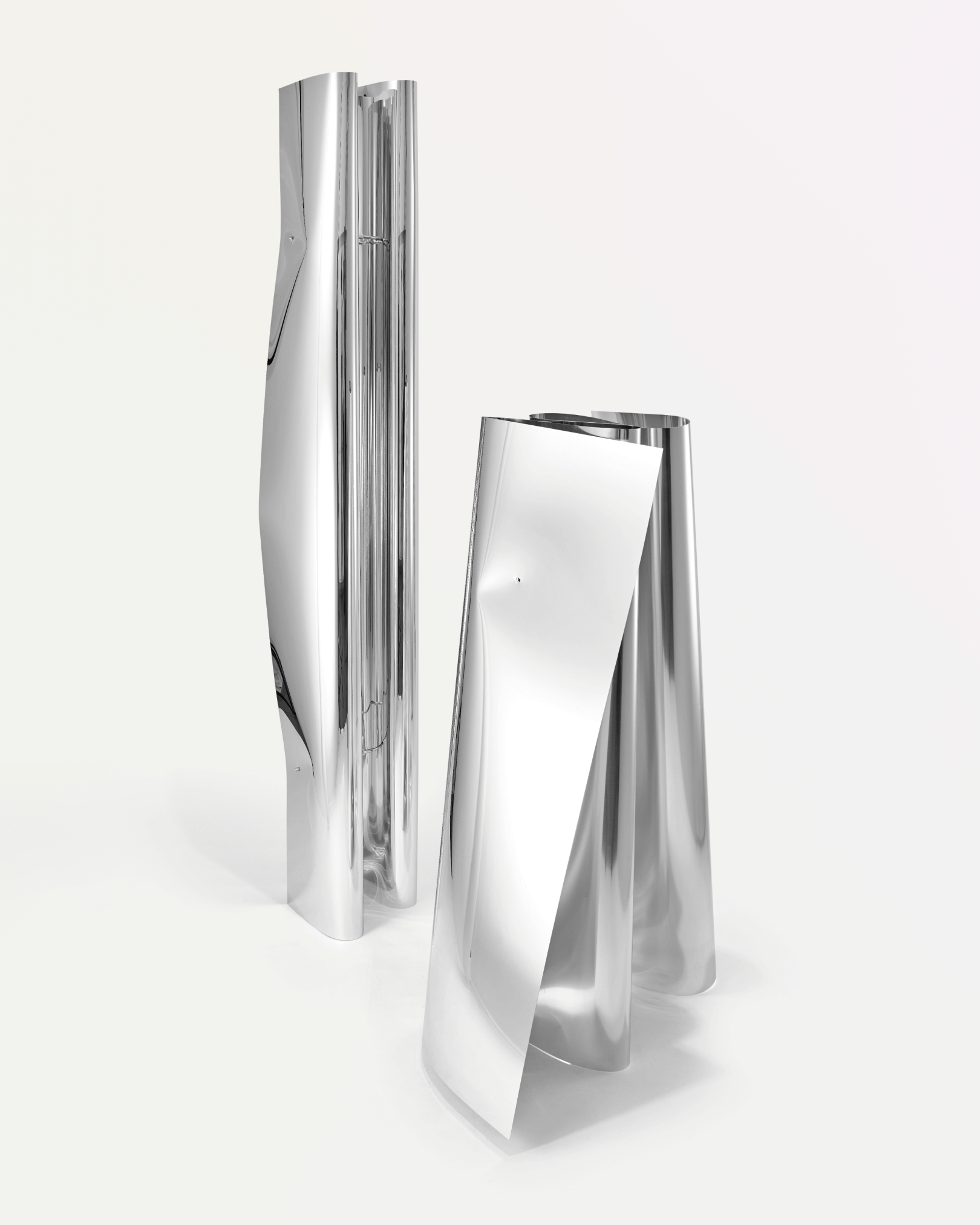 The abstract sculptures are made out of folded 1 millimeter mirrored sheets of aluminum. Hand made and every piece is unique. Available in multiple sizes. Contact for more information.