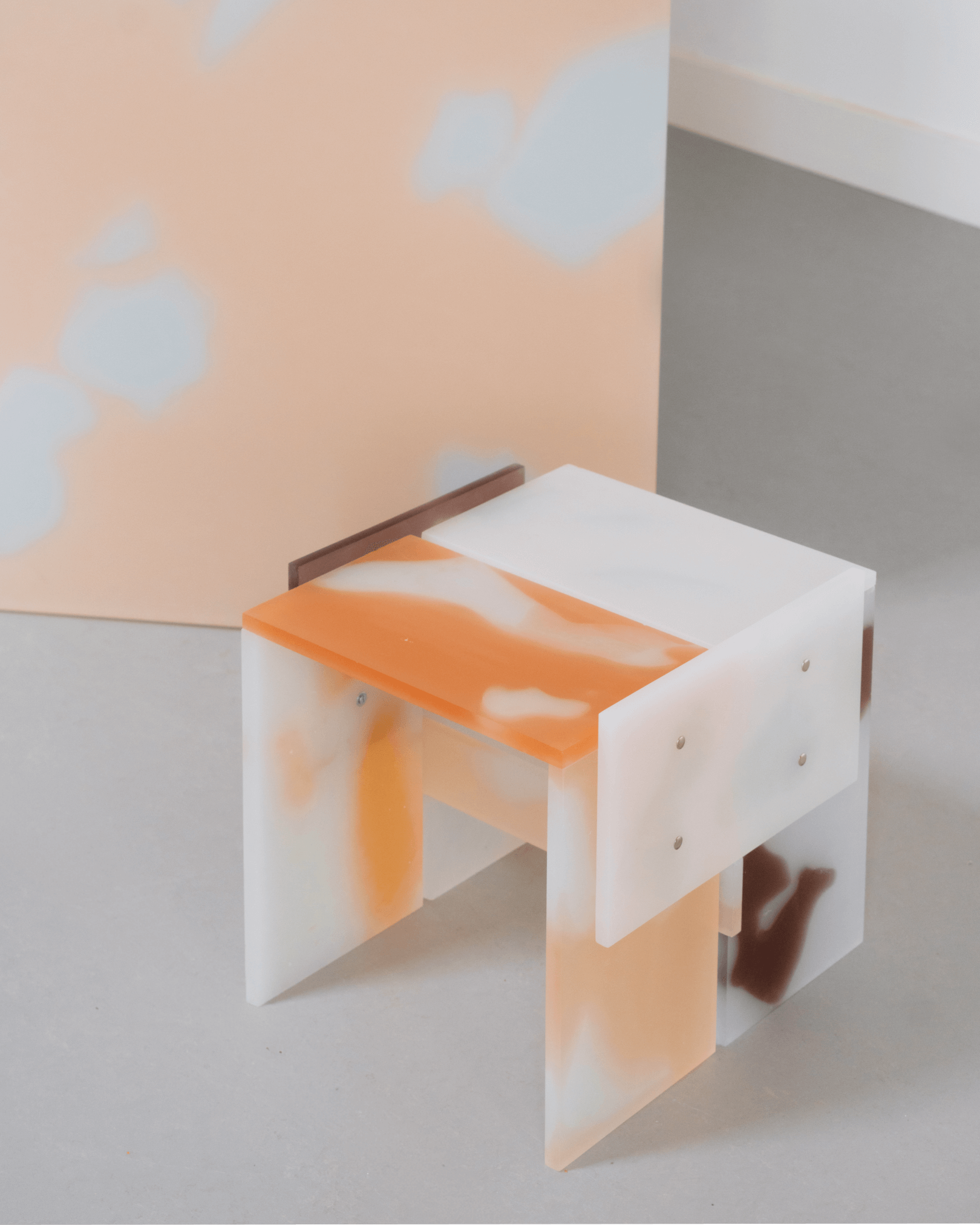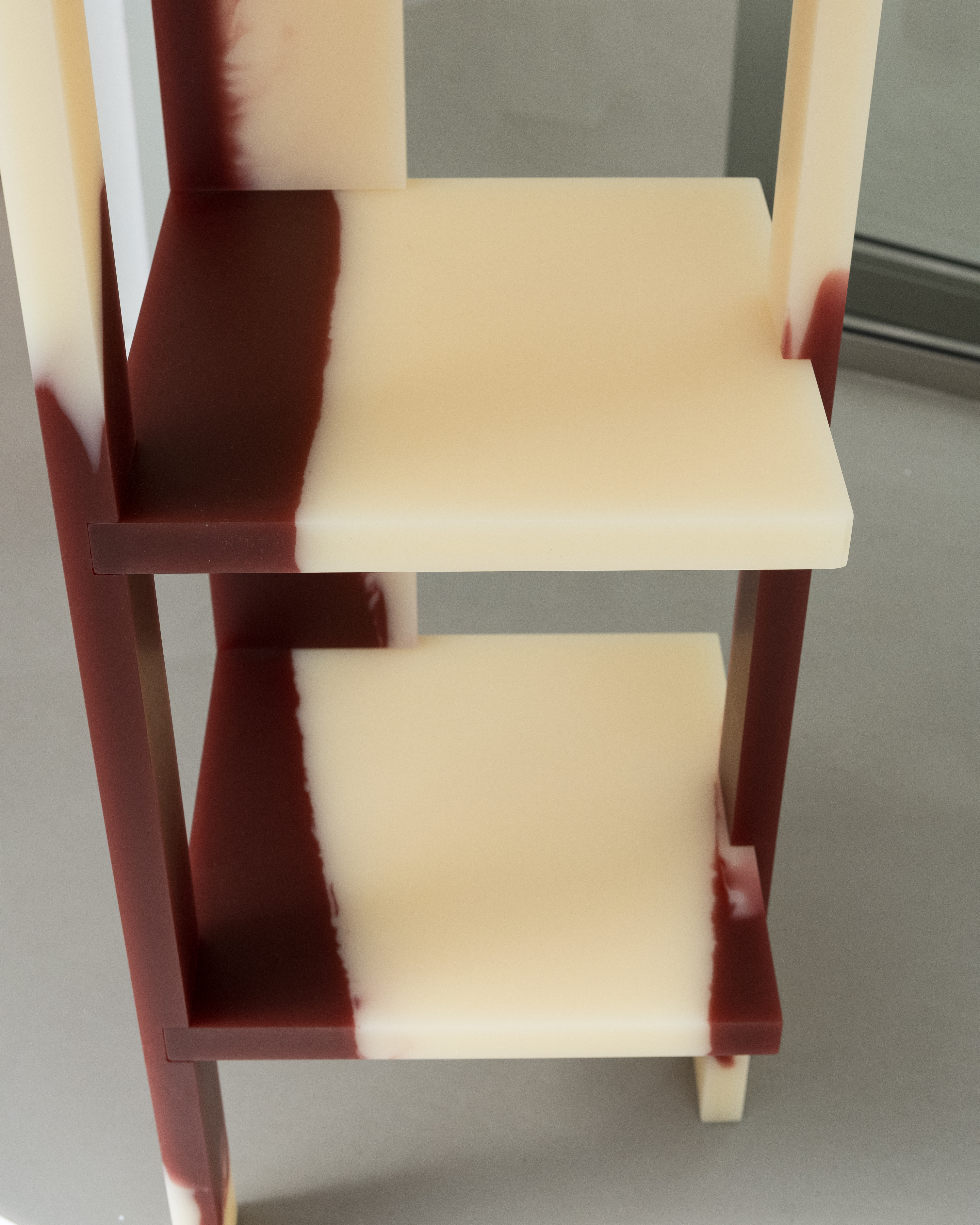 6 different colours of casted resin, coming together in one basic rectangular shape. The light is emphasising the individual colors and the fusion of the materials. 2 unique pieces.