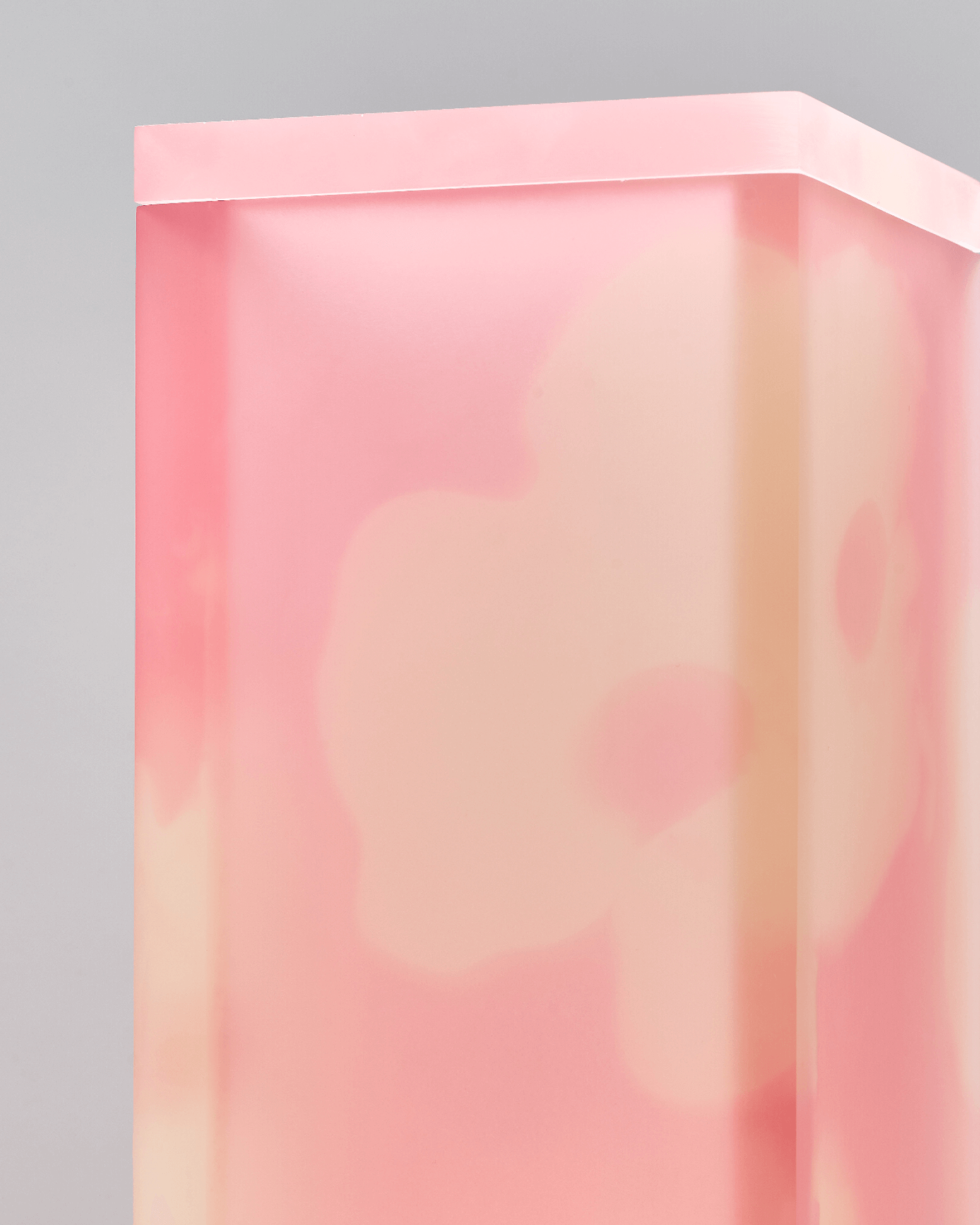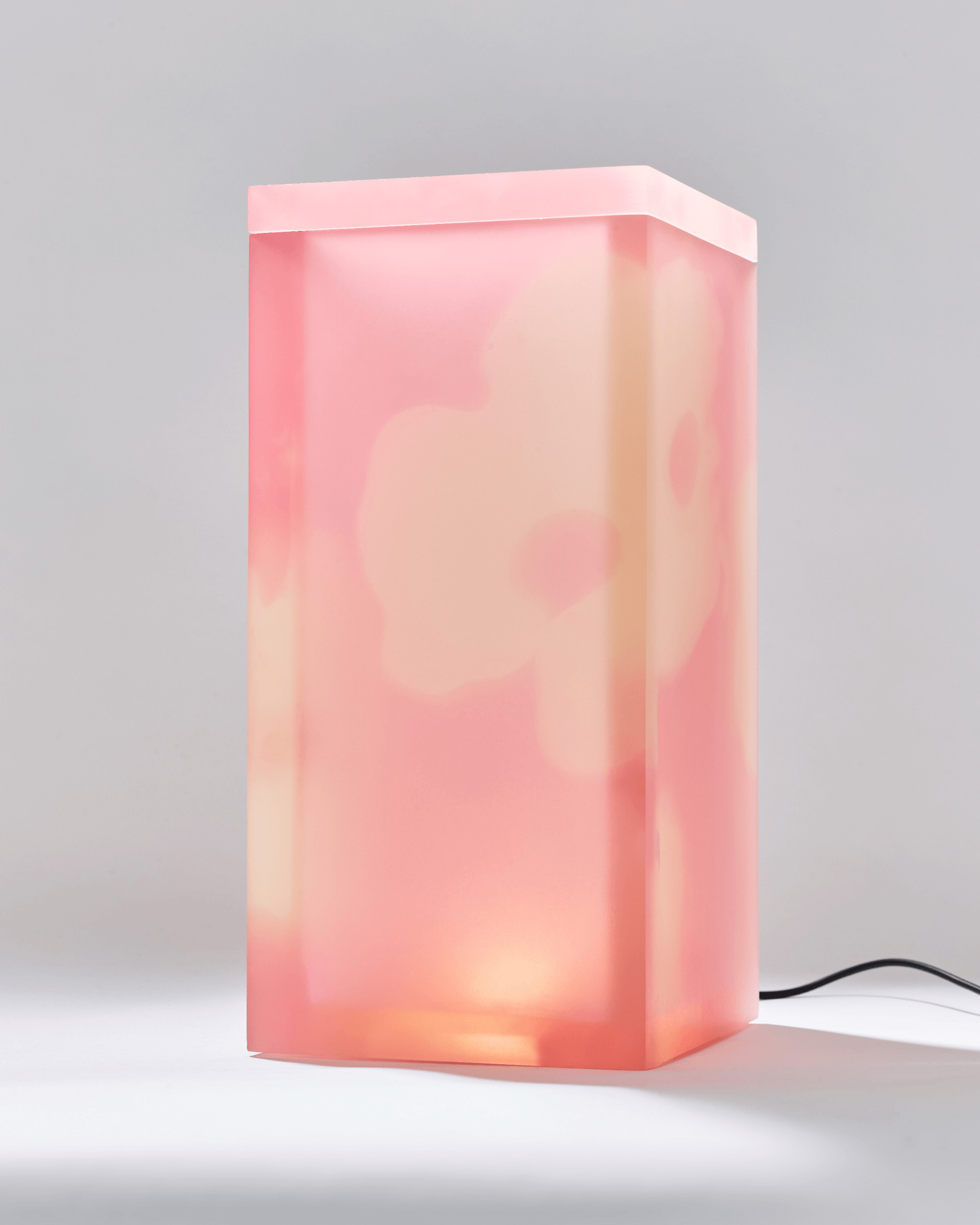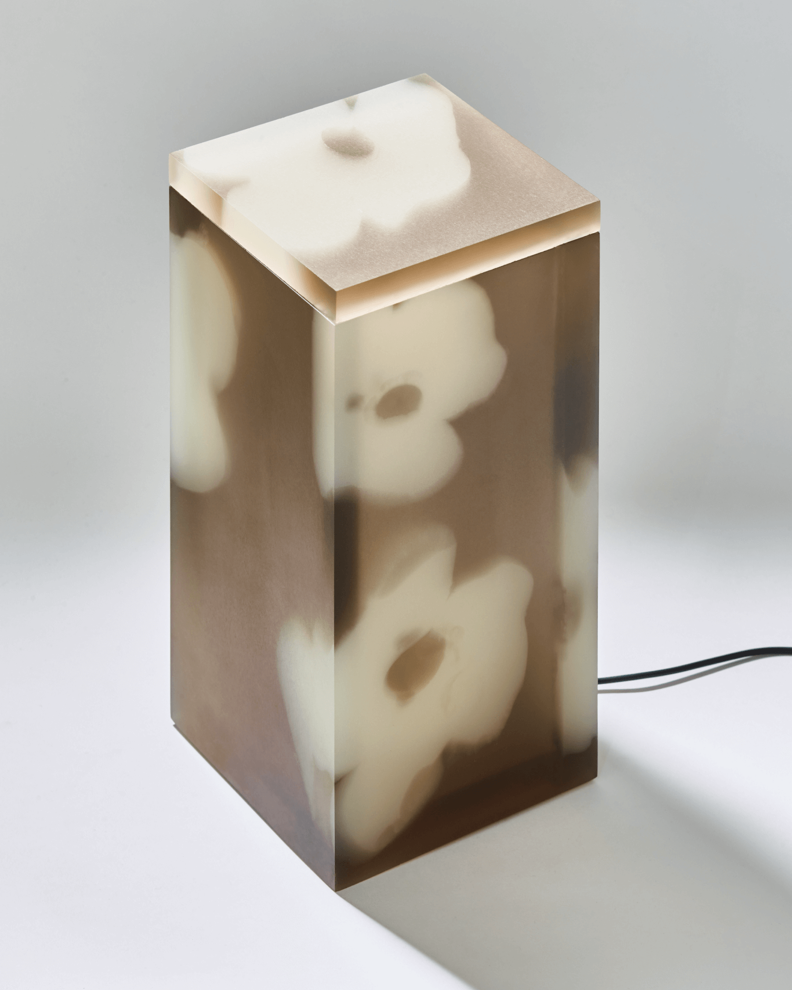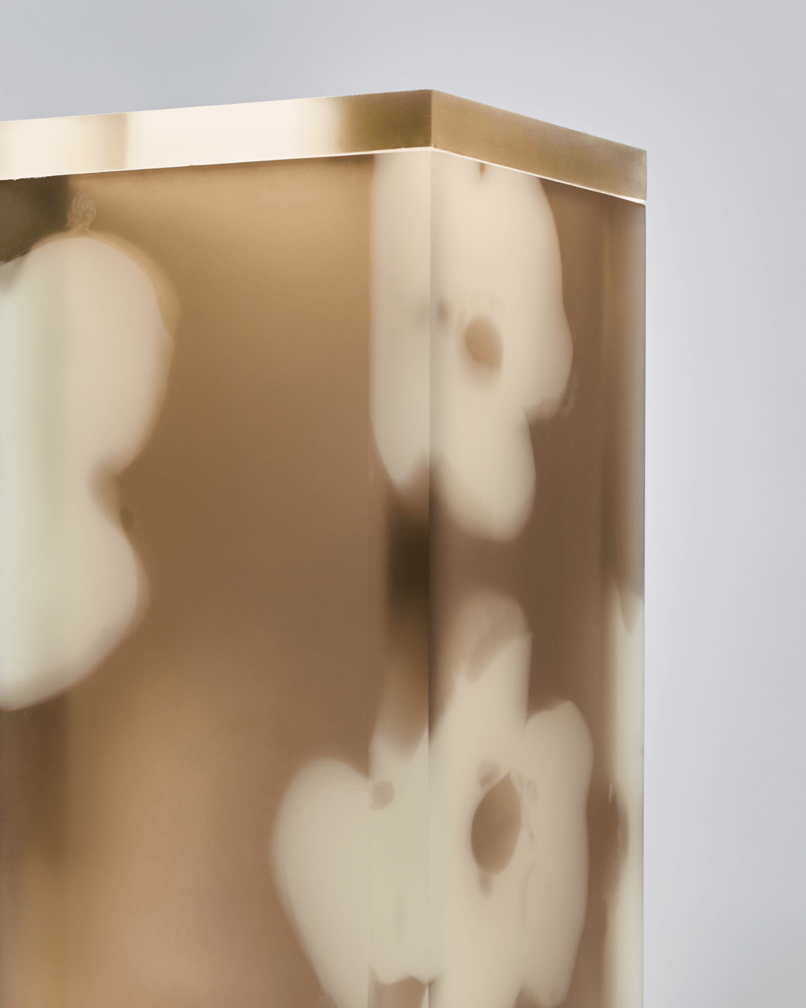 Flower pattern divided in 5 plates, combined in a simple rectangular shape creating different light effects that vary from every angle. Material made with a bespoke liquid resin color blend technique.