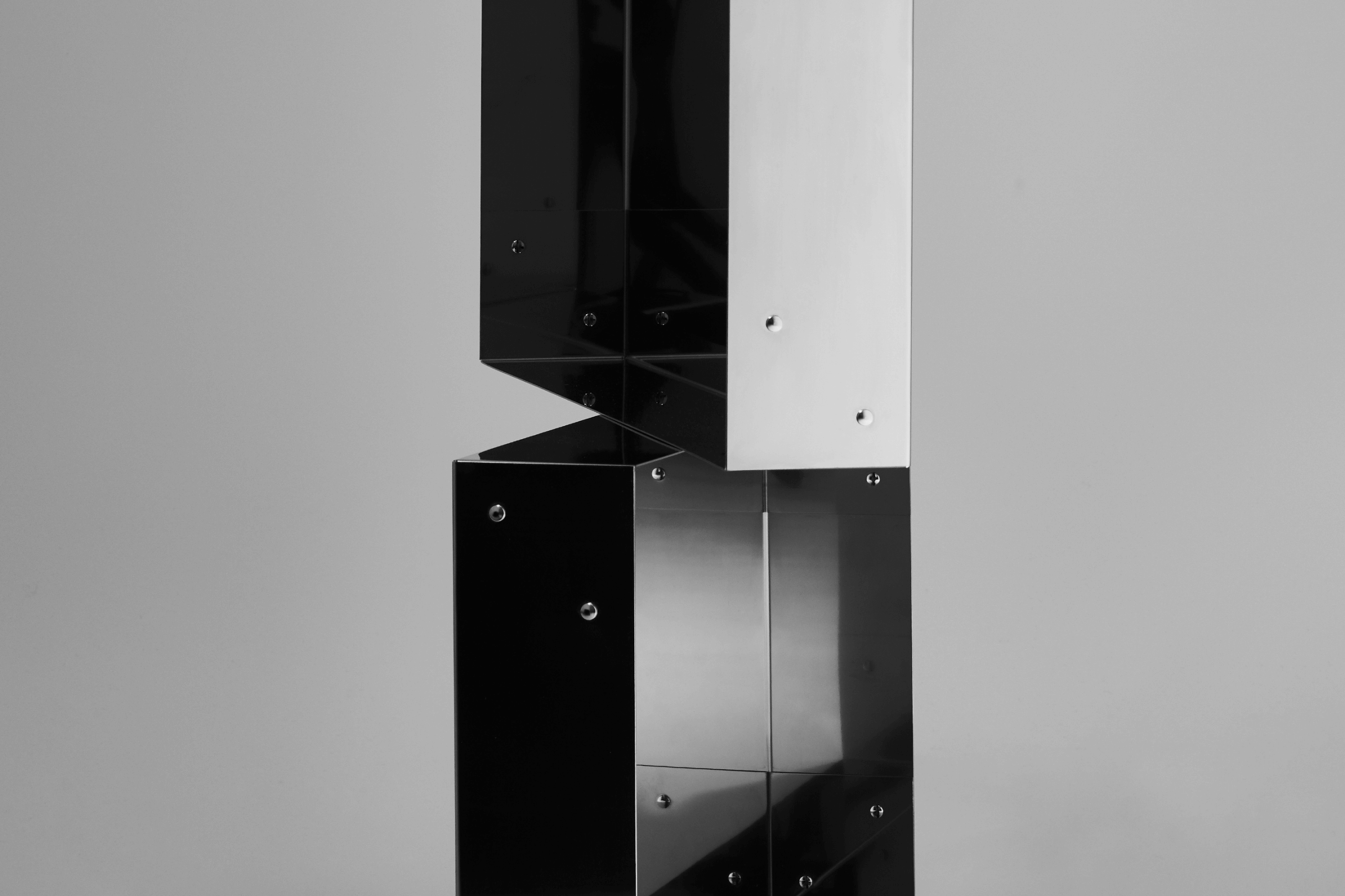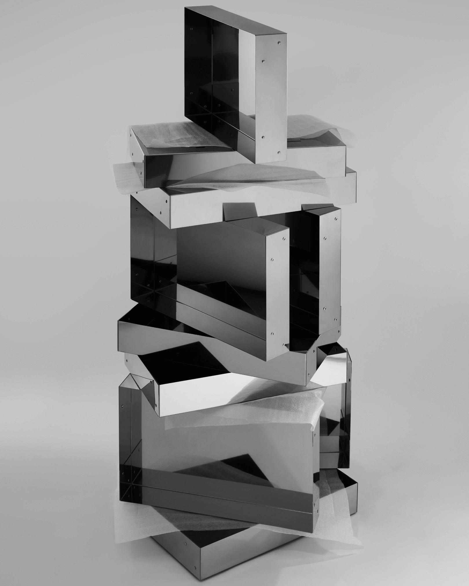 Polished stainless steel turned into a 3 dimensional shape by folding only one plate. Available in 3 sizes: small, medium and large. Contact us for more information.